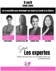 Le 9 avril, à midi, BPW Montréal a définitivement programmé une série d’ateliers de discussions intitulés Les expertes, offrant une belle occasion d’échanger sur l’état des lieux de la réalité professionnelle et des compétences à développer pour leurs succès dans les affaires, permettant ainsi aux participantes d’enrichir leurs connaissances sur les compétences essentielles qui protègent l’avenir de leur carrière.