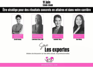 Le 9 avril, à midi, BPW Montréal a définitivement programmé une série d’ateliers de discussions intitulés Les expertes, offrant une belle occasion d’échanger sur l’état des lieux de la réalité professionnelle et des compétences à développer pour leurs succès dans les affaires, permettant ainsi aux participantes d’enrichir leurs connaissances sur les compétences essentielles qui protègent l’avenir de leur carrière.