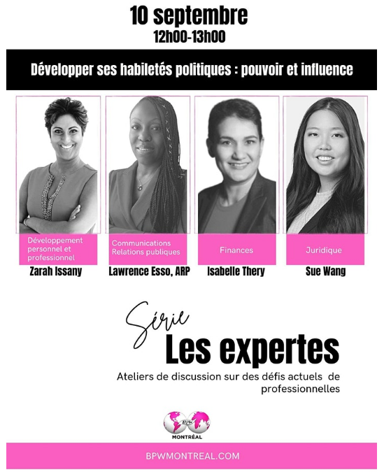 Le 10 septembre, BPW Montréal a organisé son atelier « Développer ses habiletés politiques : pouvoir et influence » dans la série Les expertes. La…